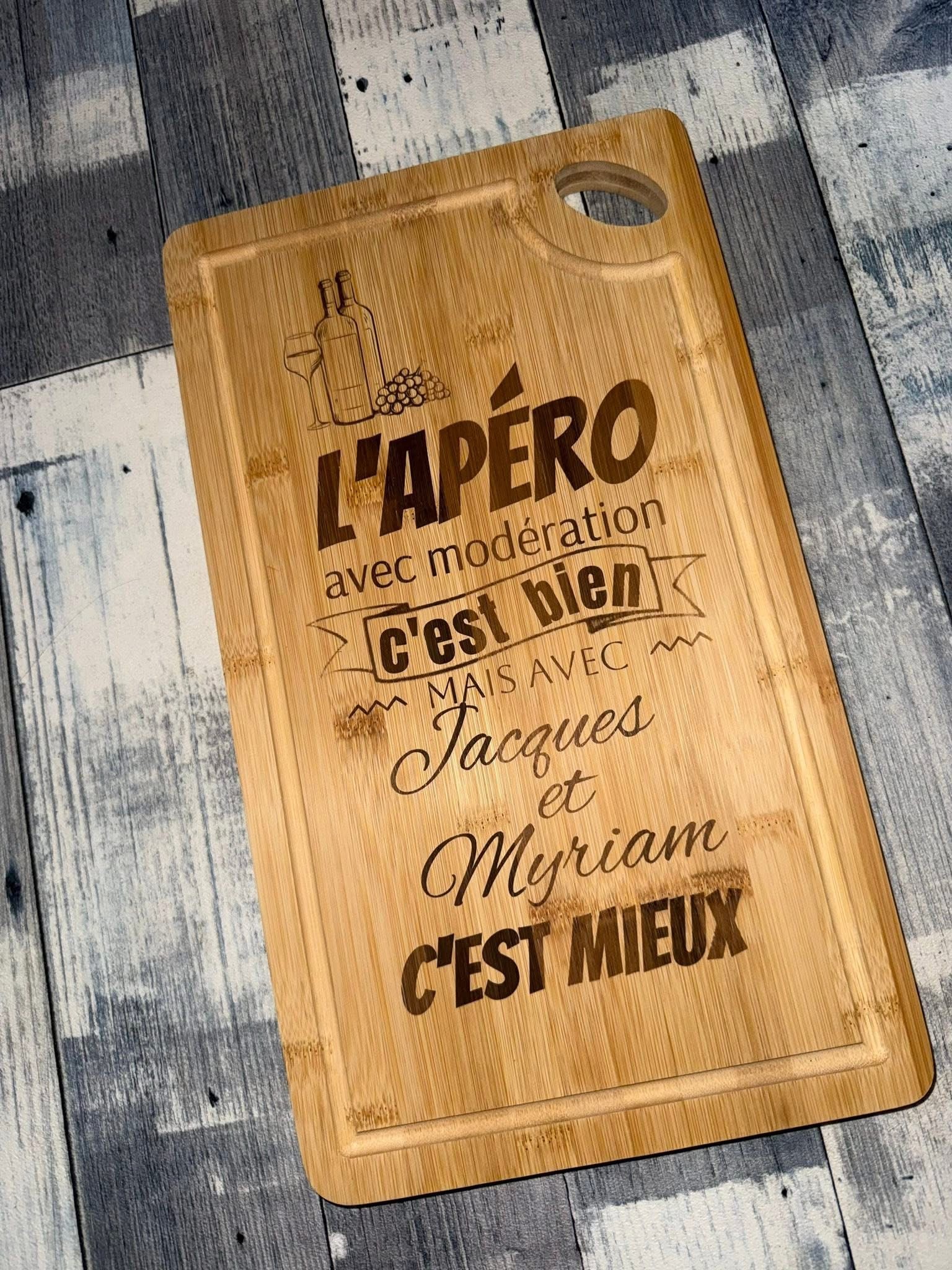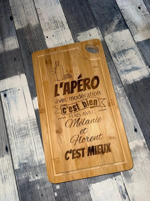 🥂 Planche apéro personnalisée en bambou – “L’apéro avec modération c’est bien… mais avec vos prénoms c’est mieux”