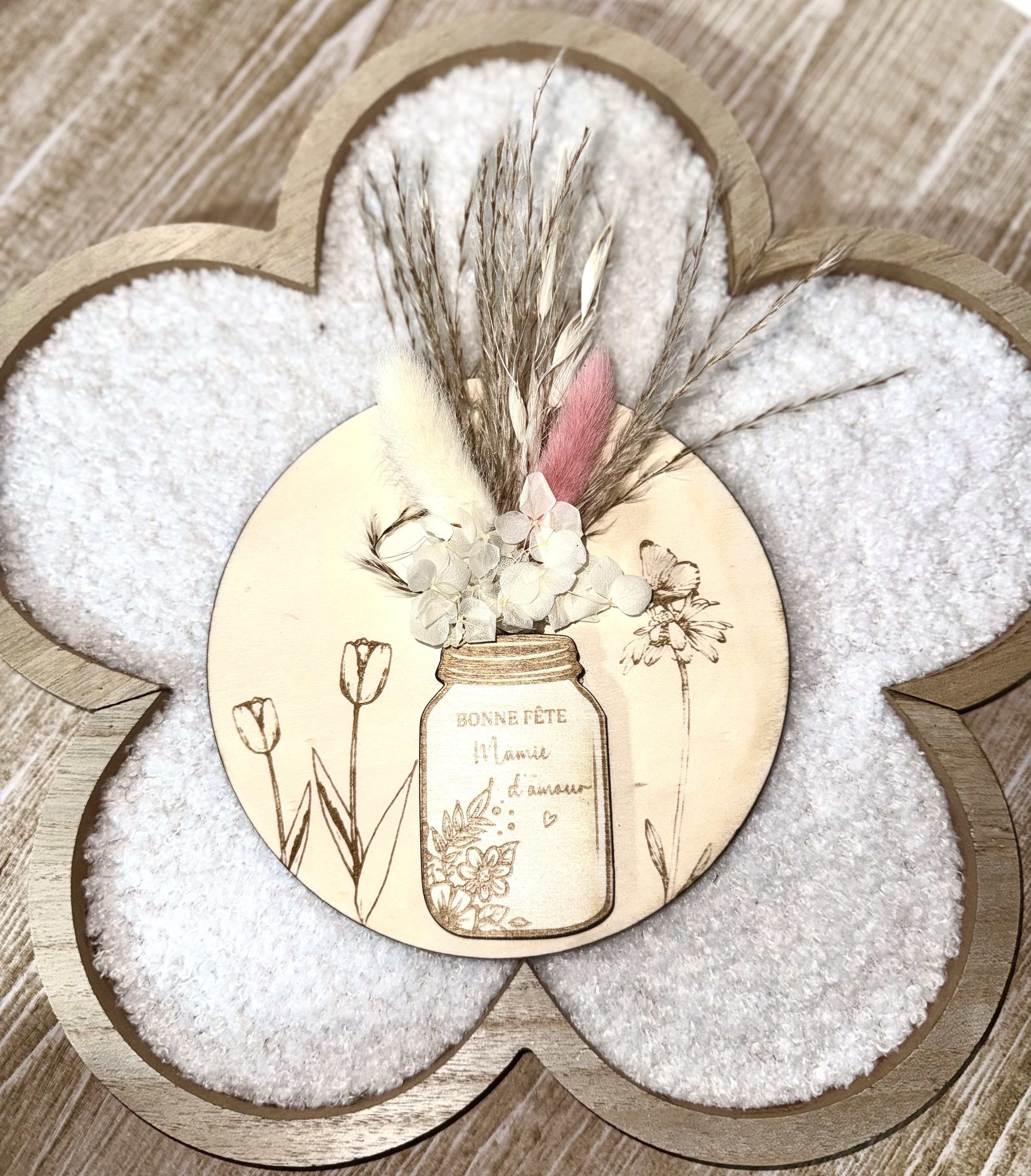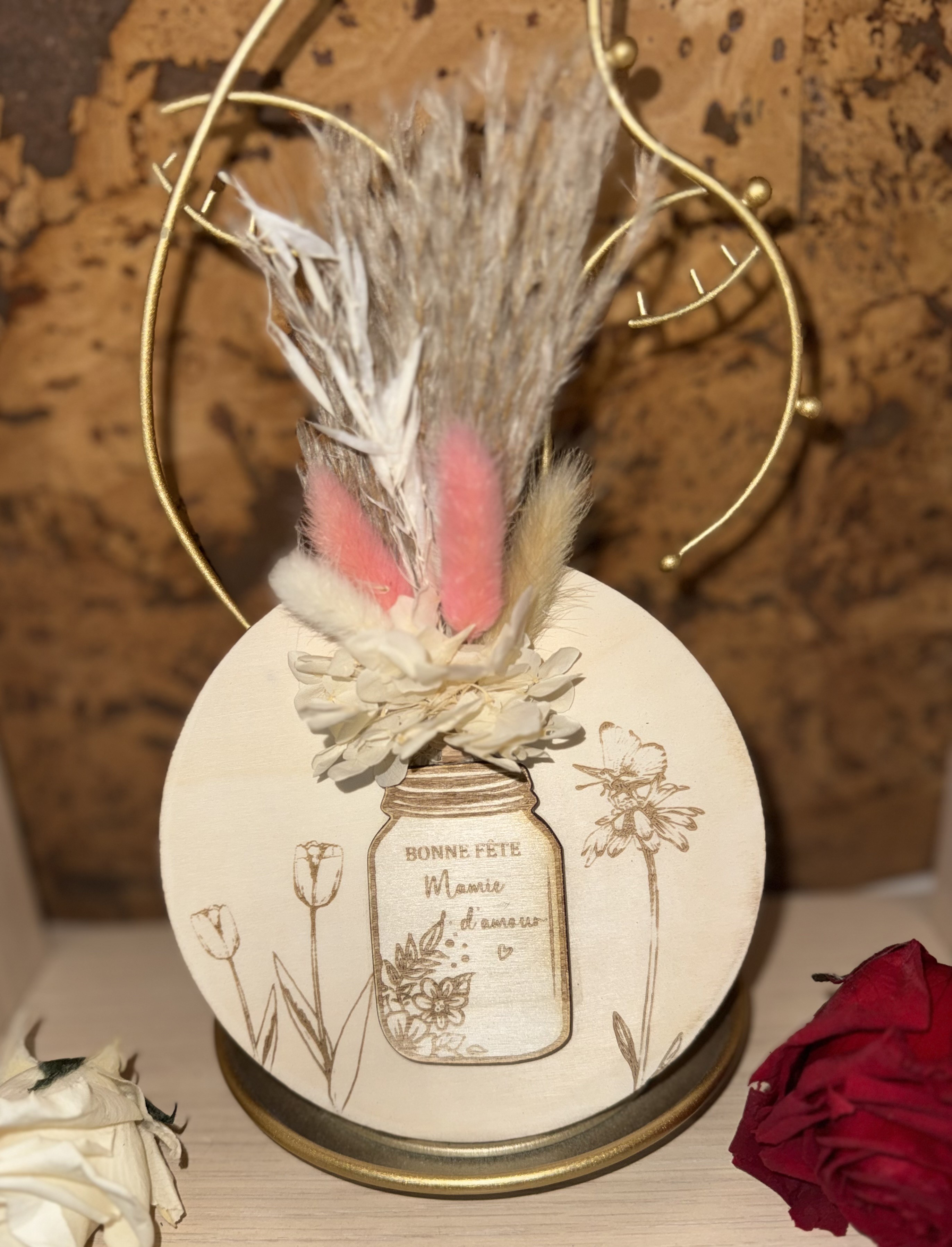Apportez une touche de poésie et de raffinement à votre intérieur avec cette magnifique jar décorative en bois. Délicatement ornée de fleurs séchées aux tons naturels et d’un élégant plumeau rosé, elle repose sur une base illustrée d’un motif floral vintage, pour un style à la fois chic et intemporel.