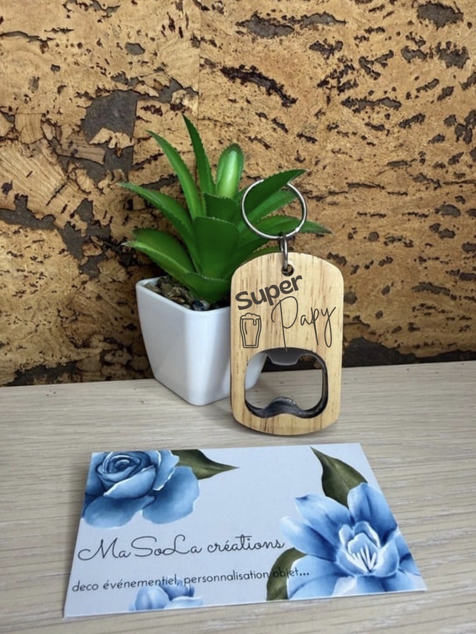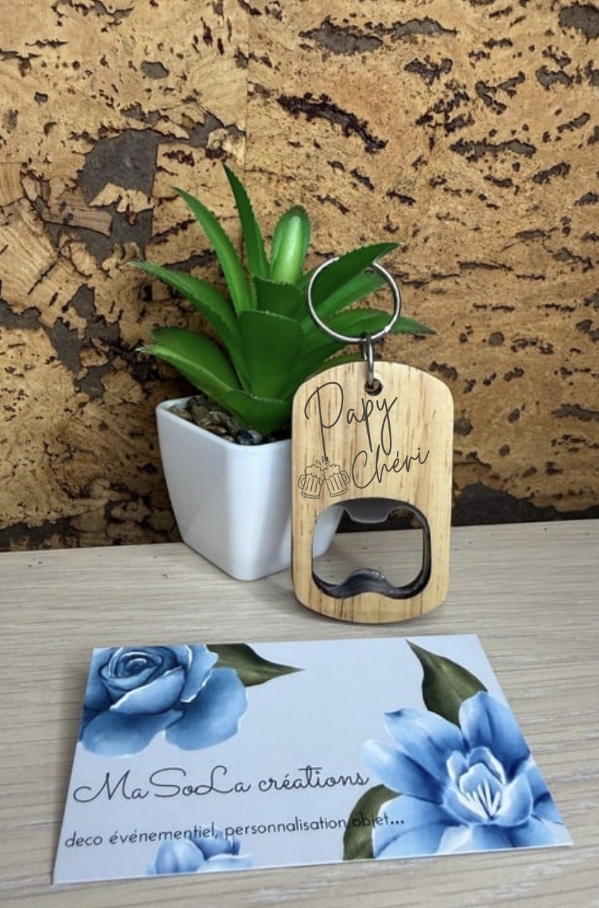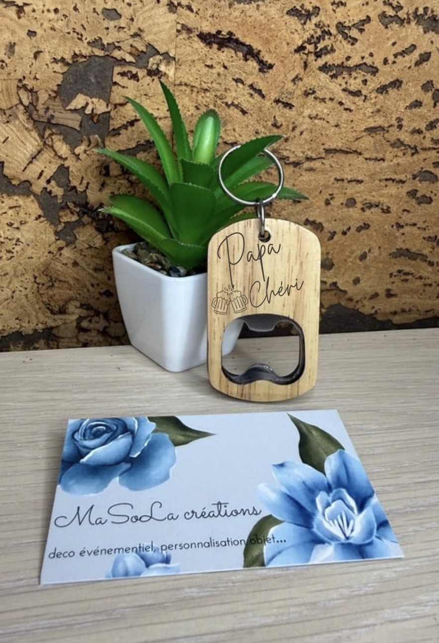 🔑 Décapsuleur porte-clés personnalisé en bois – “Papa Chéri”